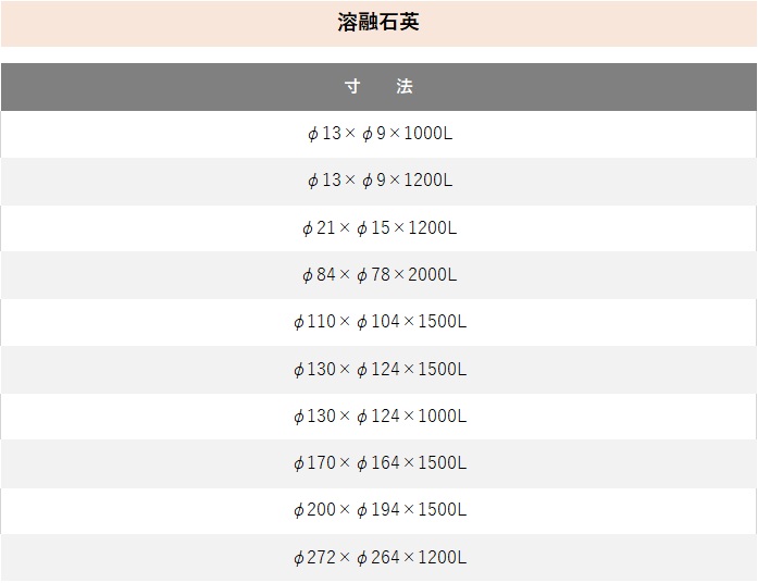 石英管 弊社では様々なサイズの石英管を取り扱っております リスト以外の取り扱いもございますので お気軽にお問い合わせください お問い合わせはこちら 〇 見積書を作成しますので お問合せページよりお願いいたします 〇 少量販売しているため 材質証明の発行はできかねますのでご了承ください 〇 欠品の可能性がありますので ご検討の際はお早めにご連絡お願いいたします 〇 ご希望に応じて詳細計測も行います 石英無垢棒 ※現在作成中
